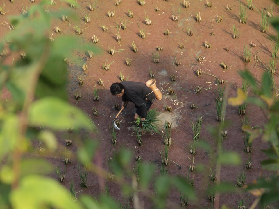 Dans une rizière, travail avec les outils traditionnels