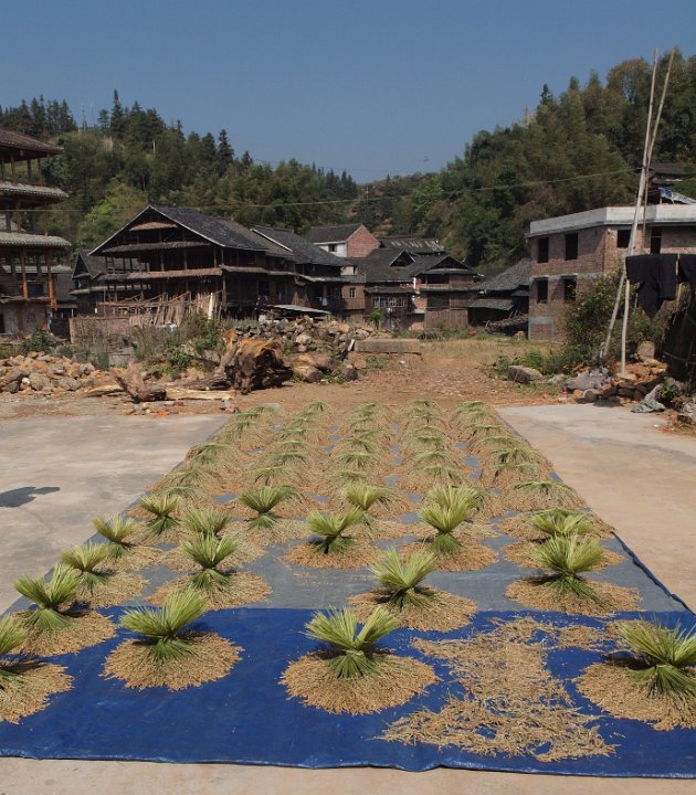 Le riz sèche devant un village.Le riz sèche devant un village.