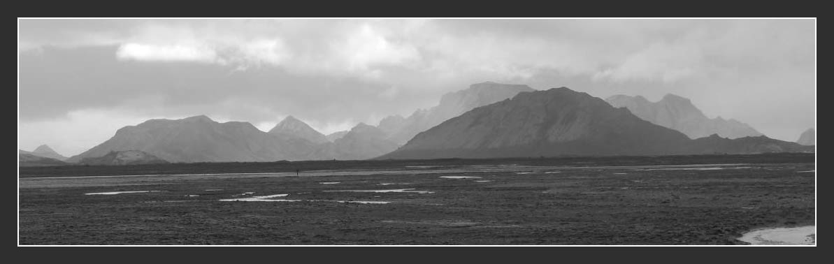 Ve 15 : nous gagnons le Maelifellssandur, vaste plaine de cendre noire et détrempée, laissée à découvert par le Myrdalsjökull qui s'est retiré. Nous troquons nos godasses contre des sandales pour mieux profiter du caractère spongieux du terrain, le tout sous un mélange intime d'averses et de coups de lumière. Une petite crête à passer et nous découvrons le Maelifell, cône parfait et tout vert de mousse, servi sur son plateau de cendres noires : cette fois-ci c'est sûr, nous ne sommes plus sur terre ! Mais un dernier gué juste avant le camp nous ramène à notre condition terrestre : allez, on en a déjà vu d'autres ! Comme il se doit, averse pour monter les tentes et beau coup de lumière en soirée.